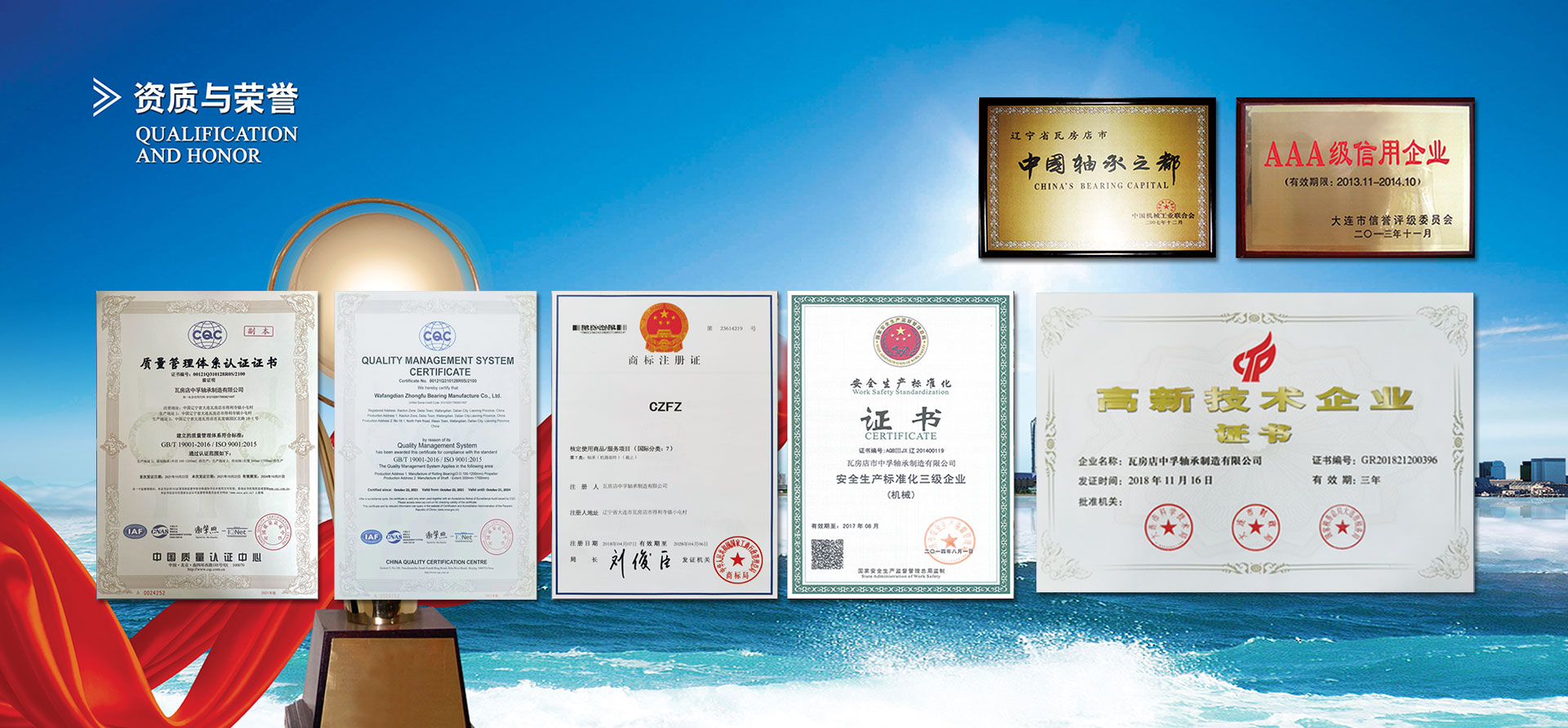 • 瓦房店中孚軸承制造有限公司專業生產礦用汽車軸承和配件,擁有獨立礦用汽車軸承設計和產品研制部門,具備開發礦用汽車軸承的能力,保證軸承的使用壽命和高穩定性建立了完整的質量體系,已通過ISO9001:2015質量管理體系認證。